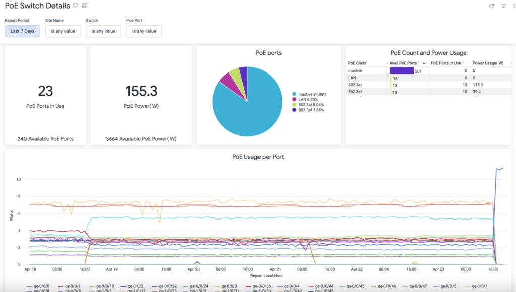 - PoE usage insights at different levels – org, site, floor, switch, and ports