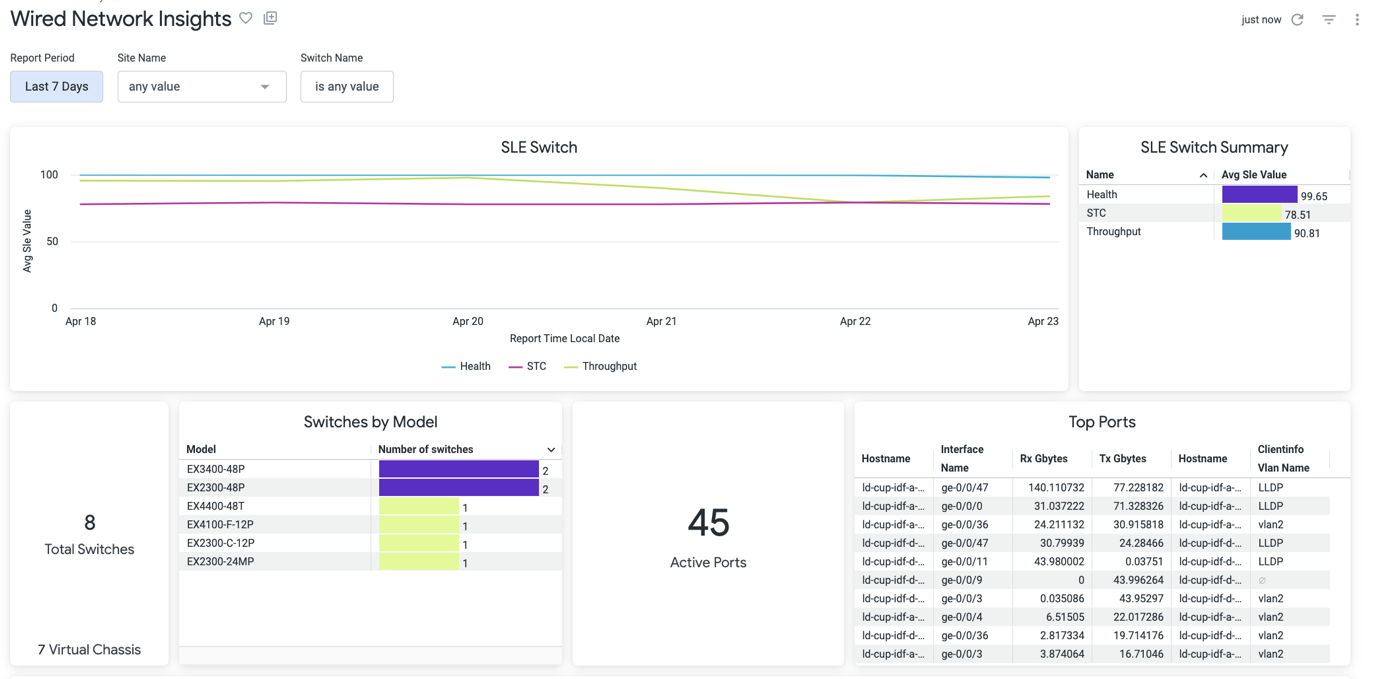 | Wired Site Comparison | This dashboard allows for the comparison of up to three sites or site groups across various wired metrics such as SLE, interfaces, traffic, and PoE |