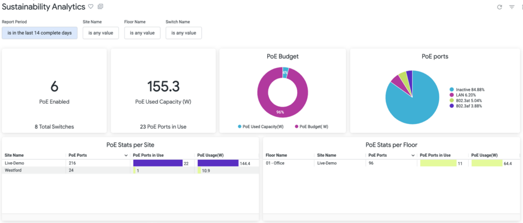 | POE Switch Details /td> | This dashboard provides switch specific insights for POE ports, power draw and consumption trends |