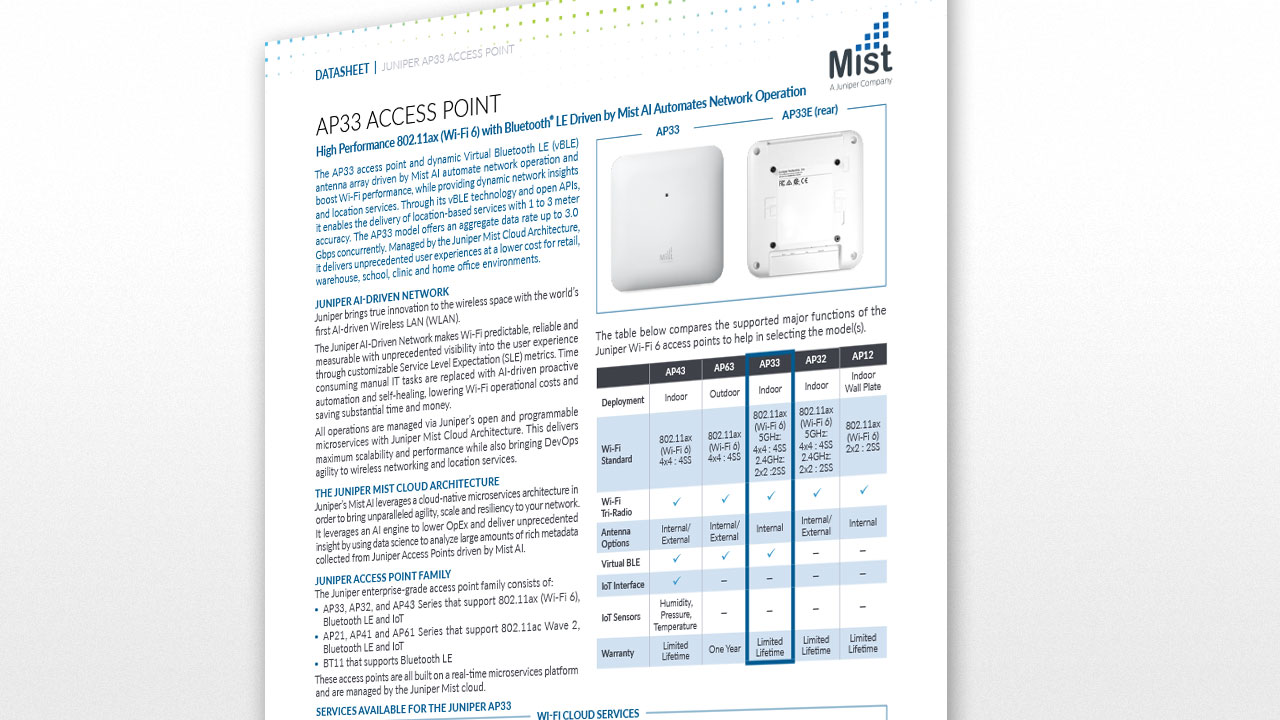 High Performance 802.11ax (Wi-Fi 6) with Bluetooth® LE Driven by Mist AI Automates Network Operation The AP33 access point and dynamic Virtual Bluetooth LE (vBLE) antenna array driven by Mist AI automate network operation and boost Wi-Fi performance, while providing dynamic network insights and location services. Through its vBLE technology and open APIs, it enables...